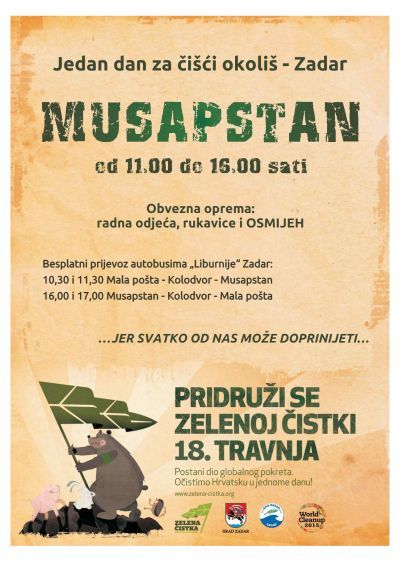 -„Eko-Zadar“ u suradnji s Gradom Zadrom, Zadarskom županijom, Hrvatskim šumama i Čistoćom d.o.o. organizira niz aktivnosti koje će se povodom Zelene čistke održati na Musapstanu gdje će se, kao i ranijih godina, prezentacijama i radionicama predstaviti brojne zadarske udruge, škole, sportski klubovi i drugi kreativci.